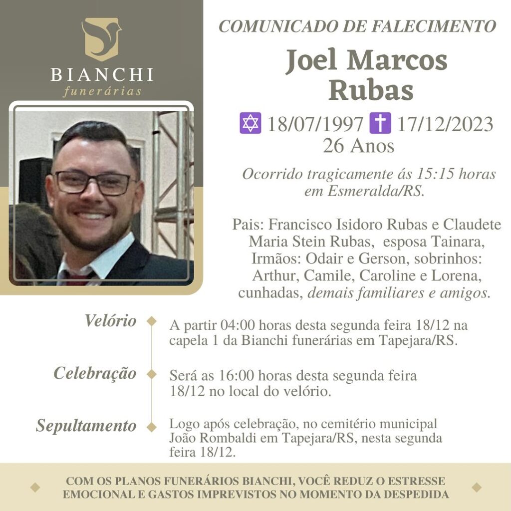 A Bianchi Funerárias, juntamente com a família Rubas, comunica com pesar, o falecimento de Joel Marcos Rubas, ocorrido às 15h15 do dia 17/12/2023 em Esmeralda – RS. Seu corpo será velado a partir das 04 horas do dia 18/12/2023 na Capela 1 da Bianchi Funerárias. Celebração às 16 horas do dia 18/12/2023 e após seu sepultamento no Cemitério Municipal João Rombaldi.