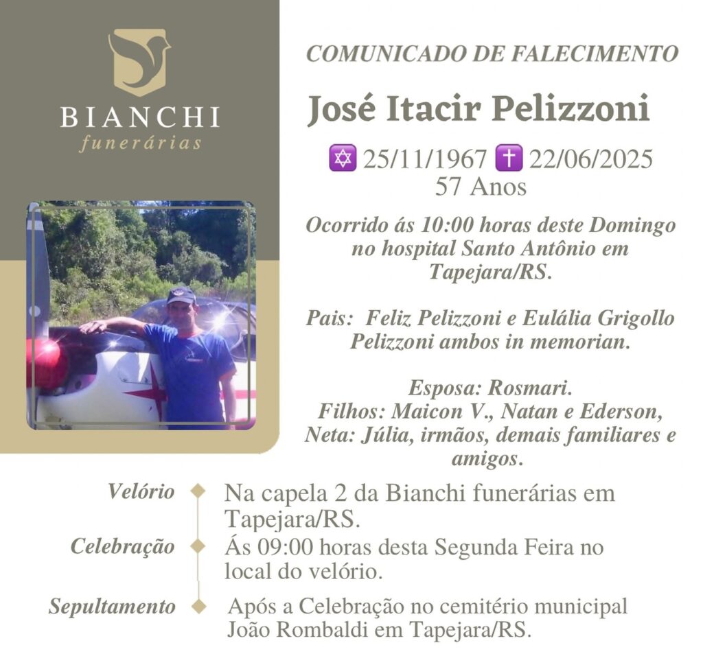 A Bianchi Funerárias, juntamente com a família Pelizzoni, comunica com pesar o falecimento de José Itacir Pelizzoni, ocorrido às 10 horas do dia 22/06/2025, no HSA de Tapejara com 57 anos de idade. Seu corpo está sendo velado na Capela 2 da Bianchi Funerárias de Tapejara. Celebração às 09 horas do dia 23/06/2025 e após seu sepultamento no Cemitério Municipal João Rombaldi.
