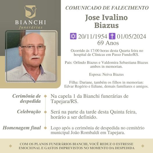 Obituário: José Ivalino Biazus admin2 2 anos atrás A Bianchi Funerárias, juntamente com a família Biazus, comunica com pesar, o falecimento de José Ivalino Biazus, ocorrido às 17 horas do dia 01/05/2024 no Hospital de Clínicas em Passo Fundo com 69 anos de idade. Seu corpo está sendo velado na Capela 1 da Bianchi Funerárias. Celebração na tarde do dia 02/05/2024 com horário a ser definido e após seu sepultamento no Cemitério Municipal João Rombaldi. Compartilhe isso: