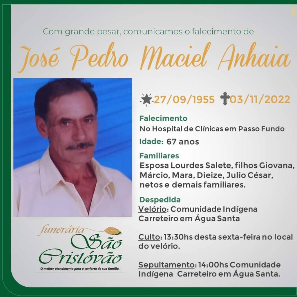 A Funerária São Cristóvão, juntamente com a família Anhaia, comunica com pesar, o falecimento de José Pedro Maciel Anhaia, ocorrido dia 03/11/2022 no Hospital de Clínicas de Passo Fundo com 67 anos de idade. Seu corpo está sendo velado na Comunidade Indígena Carreteiro de Água Santa. Culto de às 13:30 horas do dia 04/11/2022 e após seu sepultamento no Cemitério da mesma comunidade.