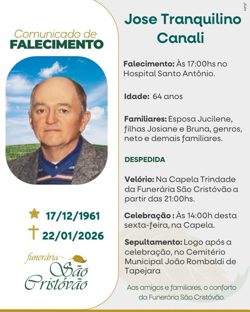 A Funerária São Cristóvão, juntamente coma família Canali, comunica com pesar, o falecimento de José Tranquilo Canali, ocorrido àS 17 horas do dia 22/01/2026 no HSA de Tapejara, com 64 anos de idade. Seu corpo está sendo velado na Capela Trindade da Funerári São Cristóvão. Celebração às 14 horas do dia 23/01/2026 e após seu sepultamento no Cemitério Municipal João Rombaldi.