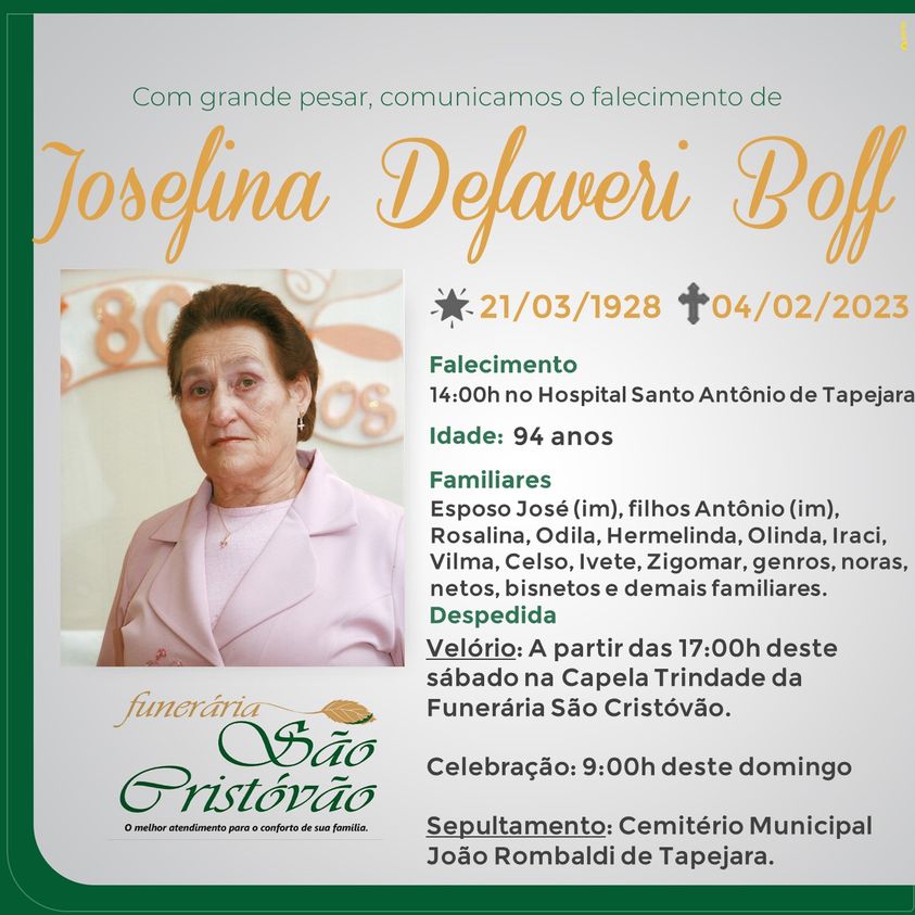 A Funerária São Cristóvão, juntamente com a família Boff, comunica com pesar, o falecimento de Josefina Defaveri Boff, ocorrido às 14:00 horas do dia 04/02/2023 no HSA com 94 anos de idade. Seu corpo está sendo velado na Capela Trindade da Funerária São Cristóvão. Celebração às 09:00 horas do dia 05/02/2023 e após seu sepultamento no Cemitério Municipal João Rombaldi.