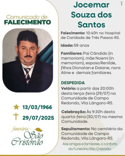 A Funerária São Cristóvão, juntamente com a família dos Santos, comunica com pesar, o falecimento de Jucemar Souza dos Santos, ocorrido às 10h40 do dia 29/07/2025 no Hospital de Caridade de Três Passos com 59 anos de idade. Seu corpo será velado a partir das 20 horas na Comunidade de Campo Redondo – Vila Lângaro. Celebração às 09h30 do dia 30/07/2025 e após seu sepultamento no Cemitério da mesma Comunidade.