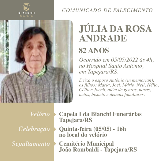 Bianchi Funerárias, comunica com pesar, o falecimento da senhora JÚLIA DA ROSA ANDRADE, com 82 anos de idade, ocorrido em 05/05/2022 às 4h, no Hospital Santo Antônio, em Tapejara/RS. Júlia deixa o esposo Antônio (in memorian), os filhos: Maria, Joel, Mário, Neli, Hélio, Célio e Joceli, além de genros, noras, netos, bisneto e demais familiares. Seu corpo está sendo velado na Capela I da Bianchi Funerárias. Às 16:00 horas haverá celebração e pós seu sepultamento no Cemitério Municipal João Rombaldi.