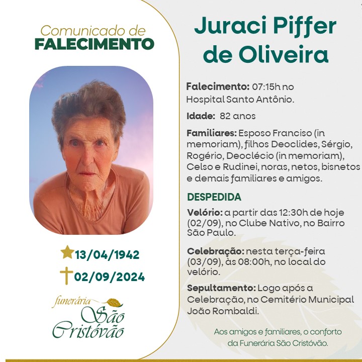 A Funerária São Cristóvão, juntamente com a família Piffer de Oliveira, comunica com pesar, o falecimento de Juraci Piffer de Oliveira, ocorrido às 07h15 do dia 02/09/2024 no HSA de Tapejara com 82 anos de idade. Seu corpo está sendo velado no Salão do Clube Nativo no Bairro São Paulo. Celebração às 08 horas do dia 03/09/2024 e após seu sepultamento no Cemitério Municipal João Rombaldi.