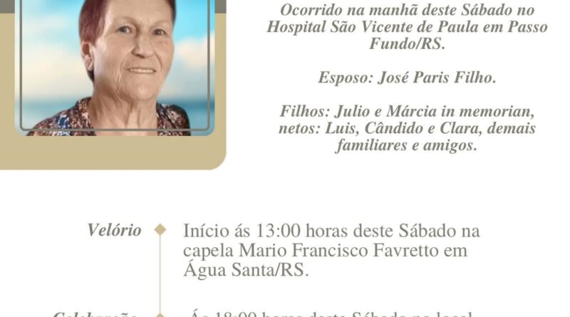 A Bianchi Funerárias juntamente com a família Paiss, comunica com pesar, o falecimento de Juracy Terres Paris, ocorrido na manhã do dia 03/01/2026 no Hospital São Vicente de Paulo em Passo Fundo com 77 anos de idade. Seu corpo está sendo velado na Capela Municipal de Água Santa. Celebração às 18 horas do dia 03/01/2026 e após seu sepultamento no Cemitério Minicipal de Água Santa.