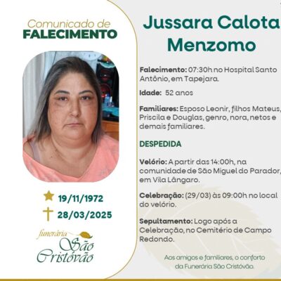 A Funerária São Cristóvão, juntamente com a família Menzomo, comunica com pesar, o falecimento de Jussara Calota Menzomo, ocorrido às 07h30 do dia 28/03/2024 no HSA de Tapejara com 52 anos de idade. Seu corpo será velado a partir das 14 horas na Comunidade de São Miguel do Parador – Vila Lângaro. Celebração às 09 horas do dia 29/03/2025 e após seu sepultamento no Cemitério da Comunidade de Campo Redondo.