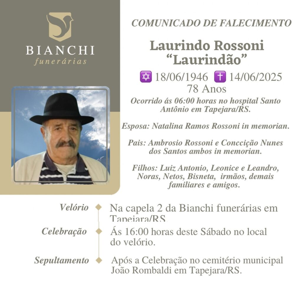 A Bianchi Funerárias, juntamente com a família Rossoni, comunica com pesar, o falecimento de Laurindo Rossoni – “Laurindão”, ocorrido às 06 horas do dia 14/06/2025 no HSA de Tapejara com 78 anos de idade. Seu corpo está sendo velado na Capela 2 da Bianchi Funerárias. . Celebração às 16 horas do dia 14/06/2025 e após seu sepultamento no Cemitério Municipal João Rombaldi.