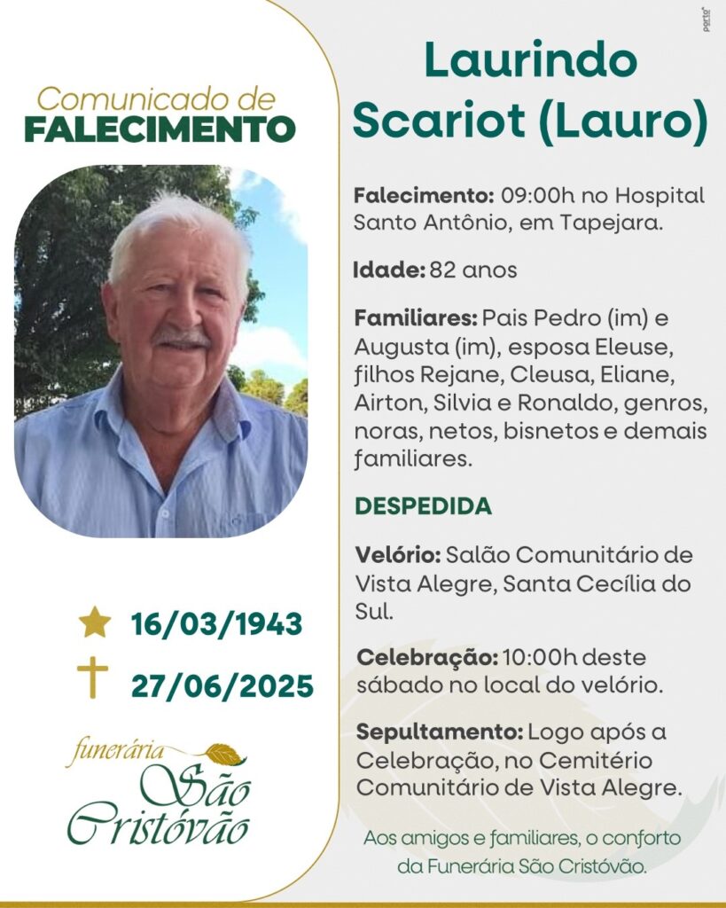 A Funerária São Cristóvão, juntamente com a família Scariot, comunica com pesar, o falecimento de Laurindo Scariot – “Lauro”, ocorrido às 09 horas do dia 27/06/2025 no HSA de Tapejara com 82 anos de idade. Seu corpo está sendo velado no Salão da Capela de Vista Alegre – Santa Cecília do Sul. Celebração às 10 horas do dia 28/06/2025 e após seu sepultamento no Cemitério da mesma Comunidade.