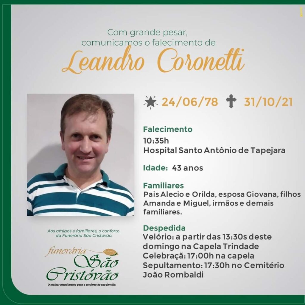 A Funerária São Cristóvão, juntamente com a família Coroneti, comunica com pesar o falecimento de Leandro Coroneti, ocorrido às 10:35h deste domingo (31/10), no Hospital Santo Antônio, em Tapejara, com 43 anos de idade. Seu corpo está sendo veladona Capela Trindade da Funerária São Cristóvão. Às 17:00h haverá celebração na capela, e logo após o sepultamento no Cemitério Municipal João Rombaldi. Leandro deixa os pais Alecio e Orilda, a esposa Giovana, os filhos Amanda e Miguel, irmãos e demais familiares.