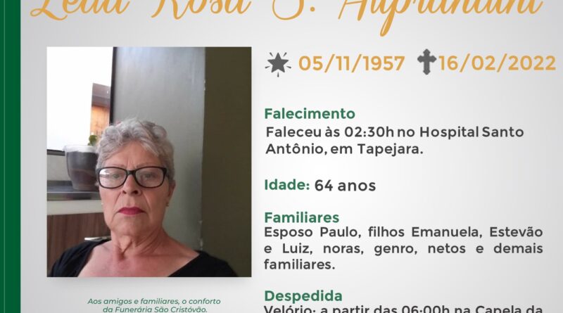 A Funerária São Cristóvão, juntamente com a família Aliprandini, comunica com pesar o falecimento da senhora Leda Rosa S. Aliprandini, ocorrido às 02:30 horas no Hospital Santo Antônio de Tapejara, com 64 anos de idade. Seu corpo está sendo velado na Capela Mortuária São Cristóvão. Celebração as 11:00 horas na capela, após seu corpo será transladado para Lagoa Vermelha onde será sepultada no Cemitério Municipal daquela cidade.