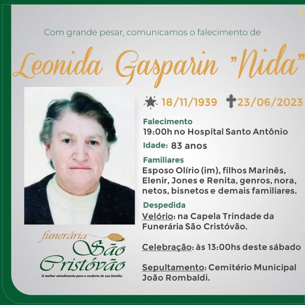 A Funerária São Cristóvão, juntamente com a família Gasparin, comunica com pesar, o falecimento de Leonida Gasparin – “Nida”, ocorrido às 19 horas do dia 23/06/2023 no HSA com 83 anos de idade. Seu corpo está sendo velado na Capela Trindade da Funerária São Cristóvão. Celebração às 13 horas do dia 24/06/2023 e após seu sepultamento no Cemitério Municipal João Rombaldi.