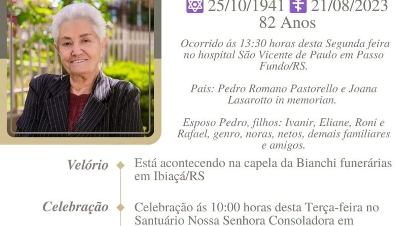 A Bianchi Funerárias, juntamente com a família Panisson, comunica com pesar, o falecimento de Leonilda Pastorello Panisson, ocorrido às 13h 30 do dia 21/08/203 no Hospital São Vicente de Paulo de Passo Fundo com 82 anos de idade. Seu corpo está sendo velado na Capela da Bianchi Funerárias de Ibiaçá. Celebração às 10 horas do dia 22/08/2023 eapós seu sepultamento no Cemitério Municipal de Ibiaçá.