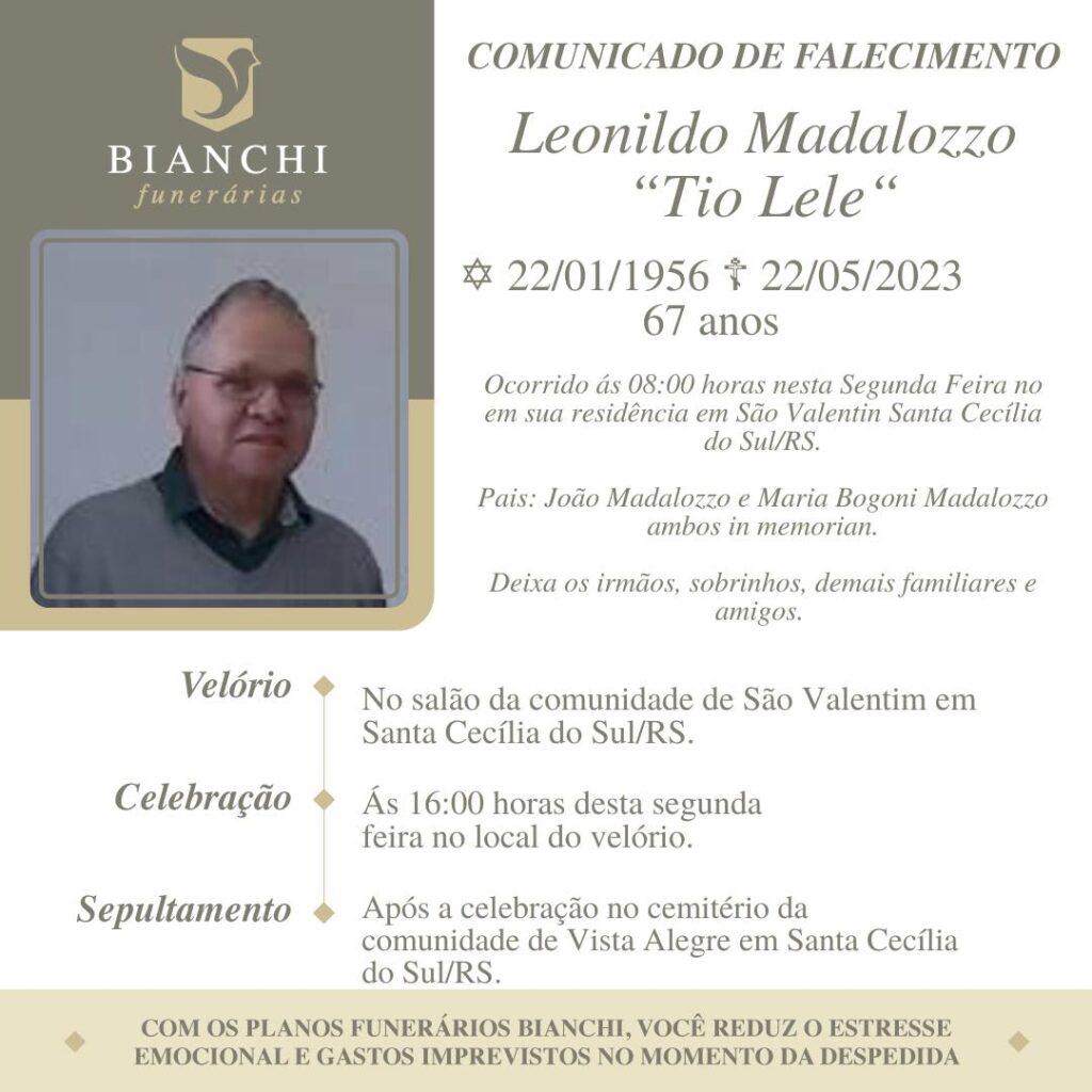 A Bianchi Funerárias, juntamente com a família Madalozzo, comunica com pesar, o falecimento de Leonildo Madalozzo – “Tio Lele”, ocorrido às 08 horas do dia 22/05/2023 em sua residência em São Valentim – Santa Cecília do Sul, com 67 anos de idade. Seu corpo está sendo velado no salão da Comunidade de São Valentim – Santa Cecília do Sul. Celebração às 16 horas e após seu sepultamento no Cemitério da mesma localidade.