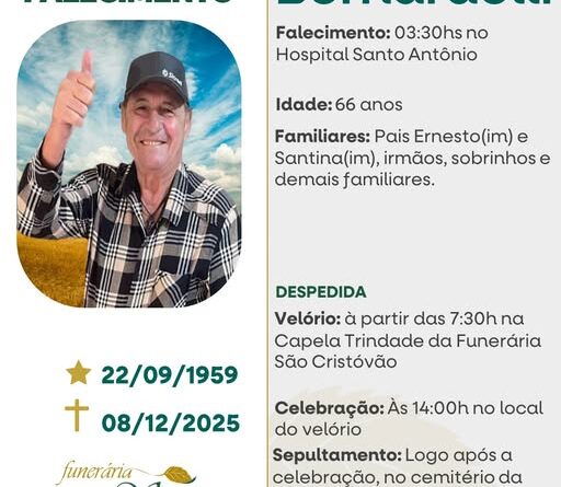 A Funerária São Cristóvão, juntamente com a família Bernardelli, comunica com pesar, o falecimento de Leonir Bernardelli, ocorrido às 03h30 do dia 08/12/2025 no HSA de Tapejara com 66 anos de idade. Seu corpo está sendo velado na Capela Trindade da Funerária São Cristóvão. Celebração às 14 horas no local do velório e após seu sepultamento no Cemitério da Comunidade de Linha 4 – Tapejara.