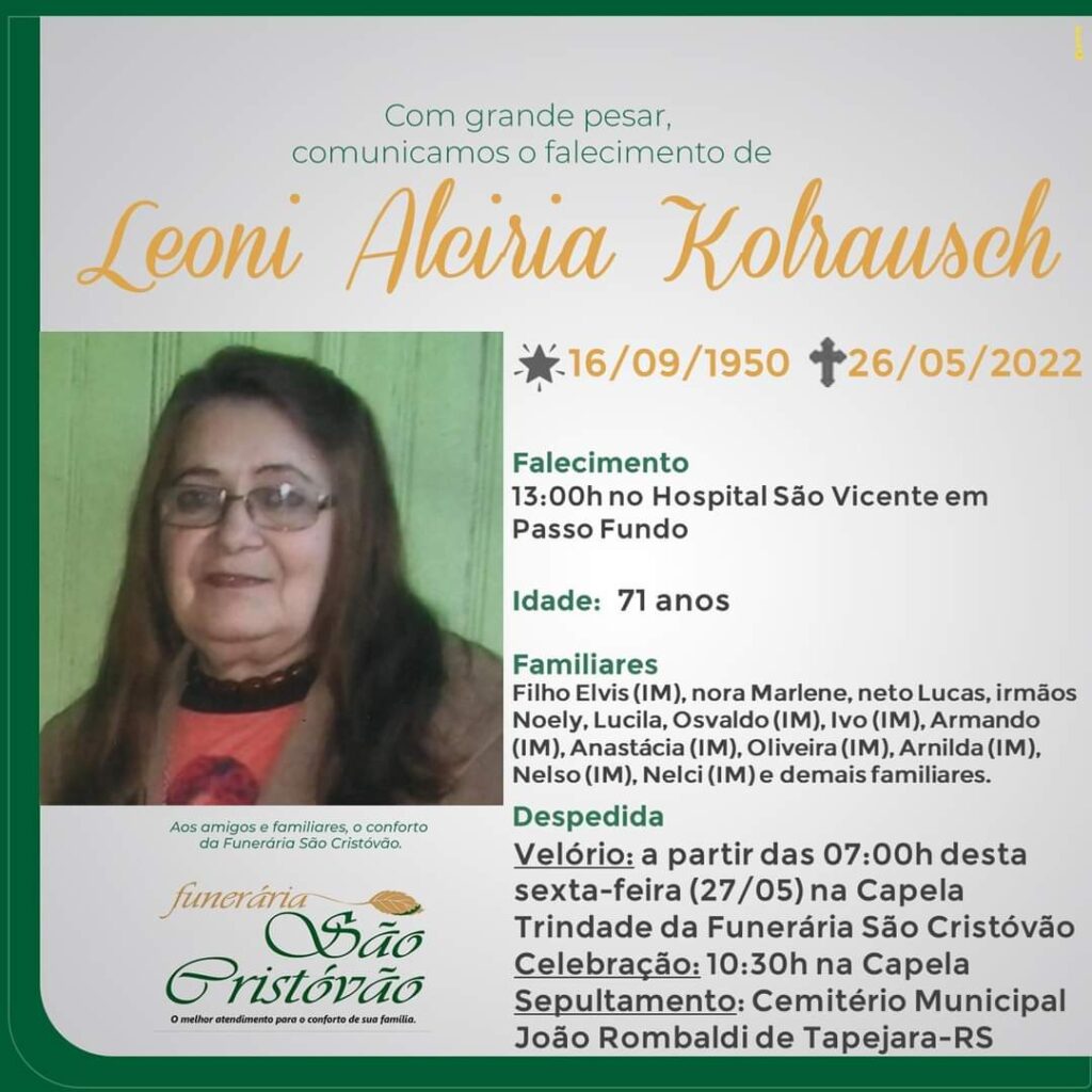 A Funerária São Cristóvão, juntamente com a família Kohlrausch, comunica com pesar, o falecimento da Sra. LEONY ALCIRIA KOHLRAUSCH, ocorrido às 13:00 horas desta quinta-feira (26/05), no Hospital São Vicente de Paulo em Passo Fundo. Seu corpo será velado a partir das 07:00 horas de sexta-feira (27/05) na Capela Trindade da Funerára são Cristóvão. Celebração às 10:30 horas e após seu sepultamento no Cemitério Municipal João Rombaldi.