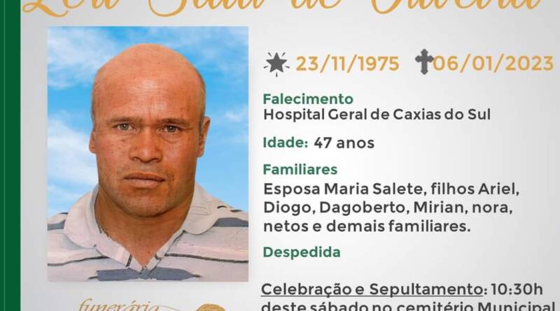 A Funerária São Cristóvão, juntamente com a família Oliveira, comunica com pesar, o falecimento de Leri Saul de Oliveira, ocorrido dia 06/01/2023 no Hospital Geral de Caxias do Sul com 47 anos de idade. Celebraçao e despedida às 10:30 horas do dia 07/01/2023 no Cemitério Municipal João Rombaldi.