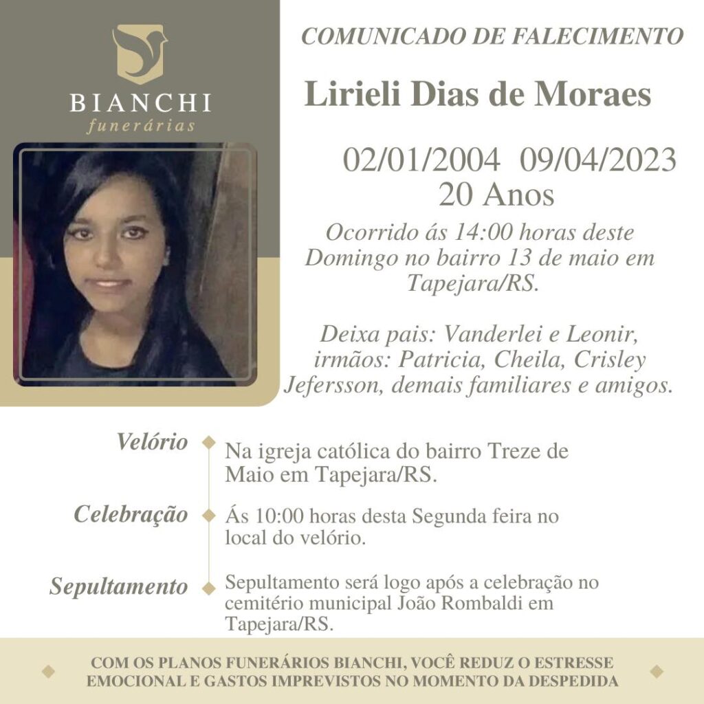 A Bianchi Funerárias, juntamente com a família Moraes, comunica com pesar, o falecimento de Lirieli Dias de Moraes, ocorrido às 14 horas do dia 09/04/2023 no Bairro 13 de Maio em Tapejara. Seu corpo está sendo velado na Igreja Católica do Bairro 13 de Maio. Celebração às 10 horas desta segunda-feira, 10/04/2023 no local do velório e após seu sepultamento no Cemitério Municipal João Rombaldi.