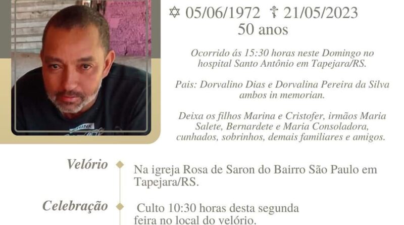 A Bianchi Funerárias, juntamente com a família Dias, comunica com pesar, o falecimento de Liviomar Antônio Dias – “Dega”, ocorrido às 15h30min dia 21/05/2023 no HSA com 50 anos de idade. Seu corpo está sendo guardado na Igreja Rosa de Sarom. Culto às 10h30min do dia 22/05/2023 e após seu sepultamento no Cemitério Municipal João Rombaldi.