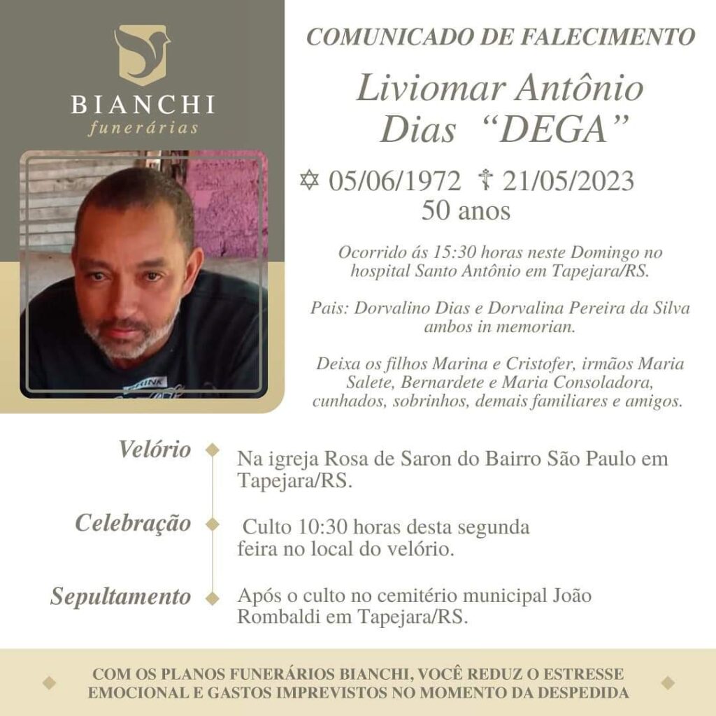 A Bianchi Funerárias, juntamente com a família Dias, comunica com pesar, o falecimento de Liviomar Antônio Dias – “Dega”, ocorrido às 15h30min dia 21/05/2023 no HSA com 50 anos de idade. Seu corpo está sendo guardado na Igreja Rosa de Sarom. Culto às 10h30min do dia 22/05/2023 e após seu sepultamento no Cemitério Municipal João Rombaldi.
