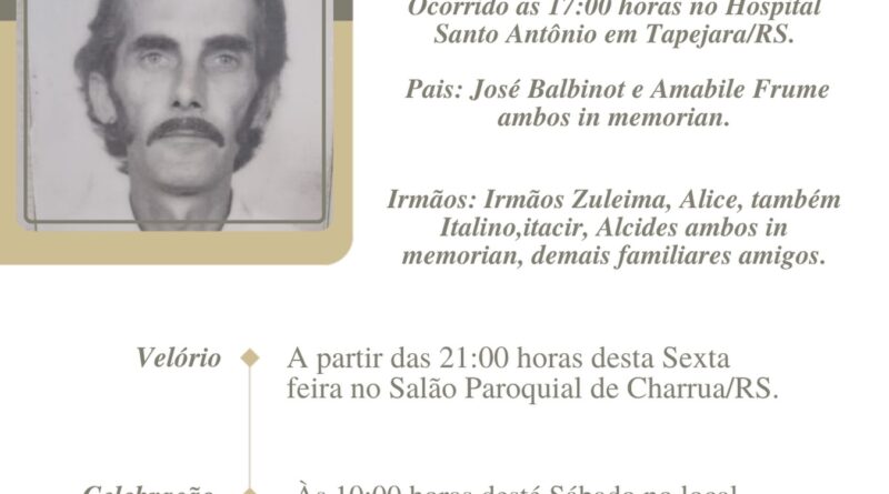 A Bianchi Funerárias, juntamente com a família da Balbinot, comunica com pesar, o falecimento de Loris Balbinot, ocorrido às 17 horas dia 27/03/2026 no HSA de Tapejara com 88 anos de idade. Seu. Corpo está sendo velado no Salão Paroquial de Charrua. Celebração às 10 horas do dia 28/03/2026 e após seu sepultamento no Cemitério Municipal de Charrua.