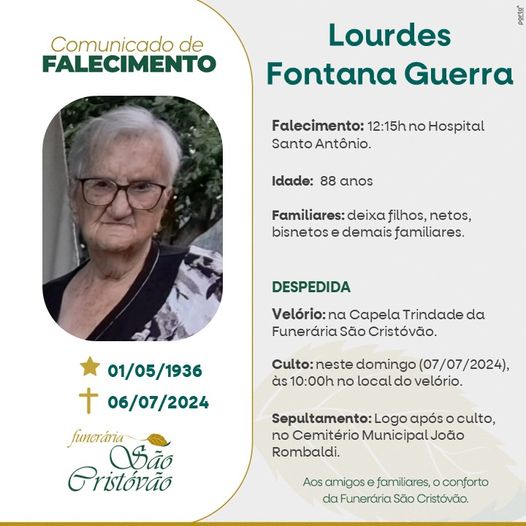 A Funerária São Cristóvão, juntamente com a família Guerra, comunica com pesar, o falecimento de Lourdes Fontana Guerra, ocorrido às 12h15 do dia 06/07/2024 no HSA de Tapejara com 88 anos de idade. Seu corpo está sendo velado na Capela Trindade da Funerária São Cristóvão. Celebração às 10 horas do dia 07/07/2024 e após seu sepultamento no Cemitério Municipal João Rombaldi.