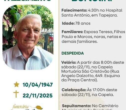 A Funerária São Cristóvão, juntamente com a família Bertolini, comunica com pesar, o falecimento de Luiz Bertolini, ocorrido às 04h30 do dia 22/11/2025 no HSA de Tapejara com 78 anos de idade. Seu corpo está sendo velado na Capela Mortuária São Cristóvão. Celebração às 17 horas do dia 22/11/2025 e após seu sepultamento no Cemitério Municipal João Rombaldi.