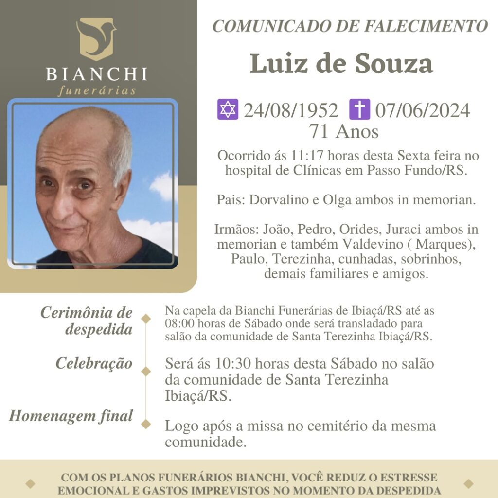 A Bianchi Funerárias, juntamente com a família Souza, comunica com pesar, o falecimento de Luiz Souza, ocorrido às 11h17 do dia 07/06/2024 no Hospital de Clínicas de Passo Fundo com 71 anos de idade. Seu corpo está sendo velado na Capela da Bianchi Funerárias de Ibiaçá, onde às 08 horas deste sábado, 08/06/2024 será transladado para o Salão da Comunidade de Santa Terezinha – Ibiaçá. Celebração às 10h30 e após seu sepultamento no Cemitério da mesma localidade.