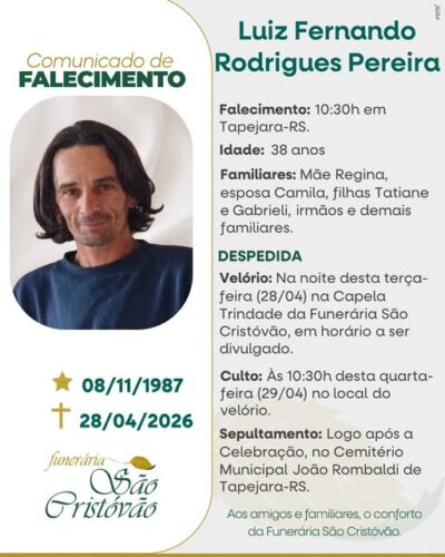 A Funerária São Cristóvão, juntamente com a família Pereira, comunica com pesar, o falecimento de Luiz Fernando Rodrigues Pereira, ocorrido às 10h30 do dia 28/04/2026 em Tapejara com 38 anos de idade. Seu corpo será guardado a partir da noite de hoje na Capela Trindade da Funerária São Cristóvão. Culto às 10h30 do dia 29/04/2026 e após seu sepultamento no Cemitério Municipal João Rombaldi de Tapejara.