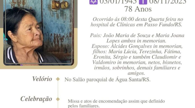 A Bianchi Funerárias, juntamente com a família de Souza, comunica com pesar, o falecimento de Lurdes de Souza, ocorrido às 08 horas do dia 08/11/2023 no Hospital de Clínicas de Passo Fundo com 78 anos de idade. Seu corpo está sendo velado no Salão Paroquial de Água Santa. Missa e atos de encomendação com horário a ser definido após seu sepultamento no Cemitério Municipal de Água Santa.