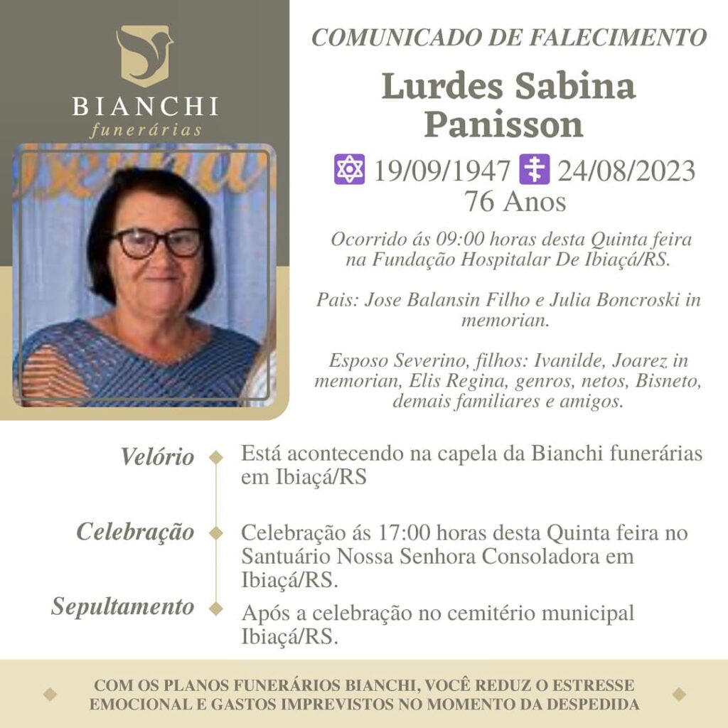 A Bianchi Funerárias, juntamente com a família Panisson, comunica com pesar, o falecimento de Lurdes Sabina Panisson, ocorrido às 09 horas do dia 24/08/2023 na Fundação Hospitalar de Ibiaçá com 76 anos de idade. Seu corpo está sendo velado na Capela da Bianchi Funerárias de Ibiaçá. Celebração às 17 horas do dia 24/08/2023 e após seu sepultamento no Cemitério Municipal de Ibiaçá.