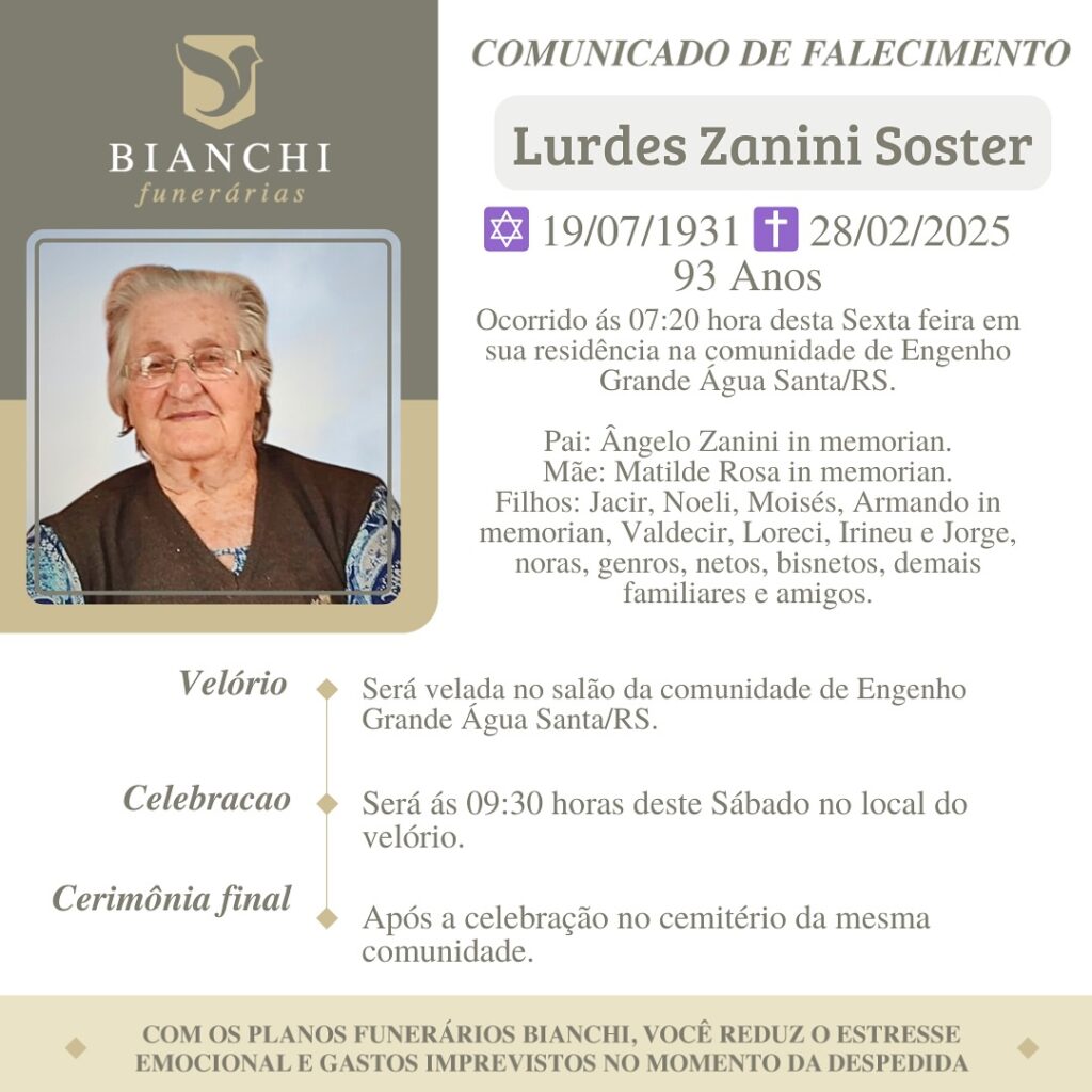 A Bianchi Funerárias, juntamente com as famílias Zanini e Soster, comunicamo com pesar o falecimento de: Lurdes Zanini Soster, com 93 anos de idade, ocorrido nesta sexta-feira (28/02), em sua residência na comunidade de Engenho Grande Água Santa/RS. Seu corpo está sendo velado no Salão Comunitário de Engenho Grande/Água Santa. Neste sábado (01/03), às 09h00, acontecerá a celebração no local do velório e, após, seu sepultamento no Cemitério da mesma comunidade.