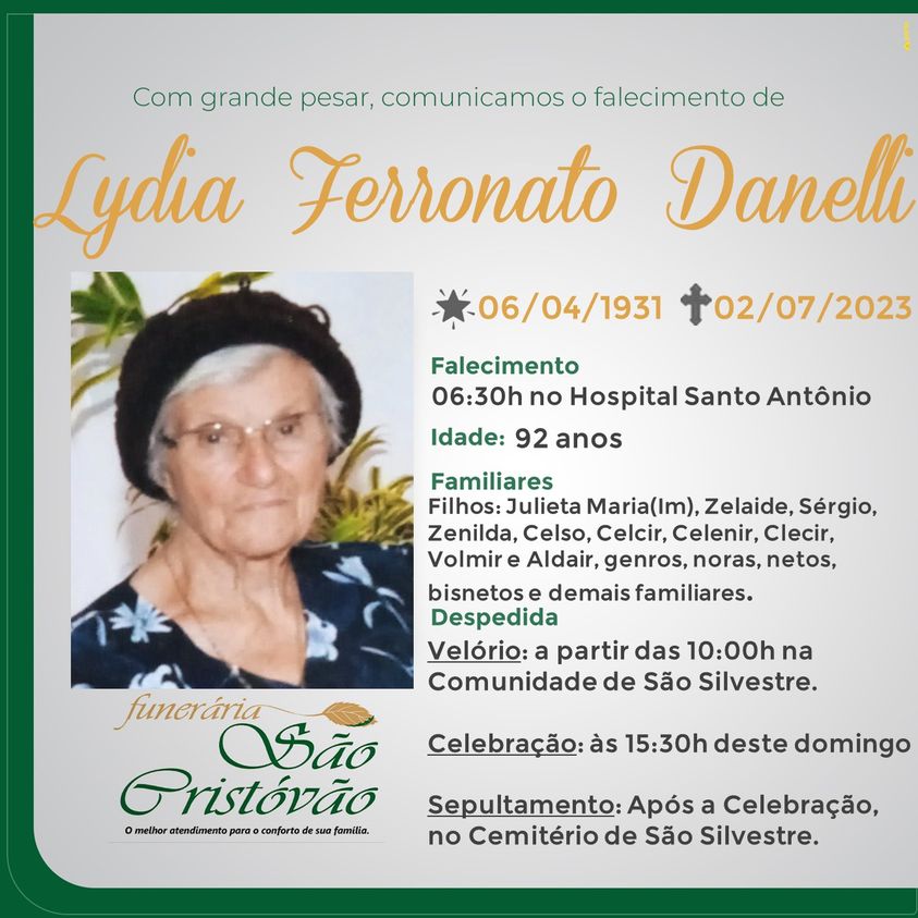 A Funerária São Cristóvão, juntamente com a família Daneli, comunica com pesar, o falecimento de Lydia Ferronato Daneli, ocorrido às 06h30 do dia 02/07/2023 no HSA com 92 anos de idade. Seu corpo está sendo velado na Comunidade de São Silvestre – Tapejara. Celebração às 15h30 e após seu sepultamento no Cemitério da mesma Comunidade.