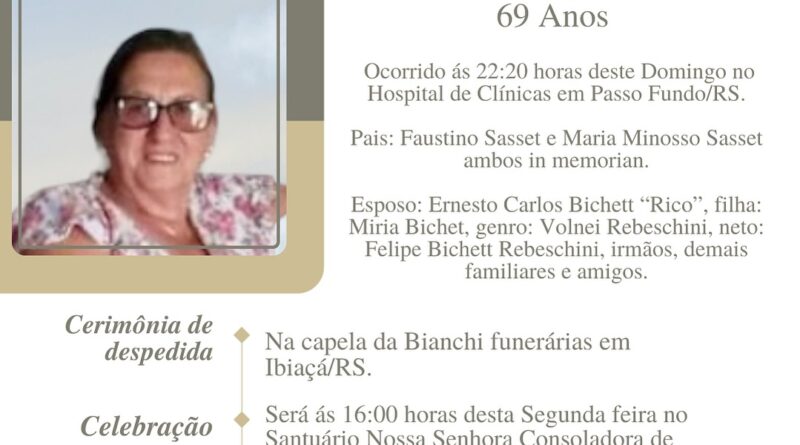 A Bianchi Funerárias, juntamente com a família Bichet, comunica com pesar, o falecimento de Mailde Sasset Bichet, ocorrido às 22 horas do dia 21/07/2024 no Hospital de Clínicas de Passo Fundo com 69 anos de idade. Seu corpo está sendo velado na Capela da Bianchi Funerárias em Ibiaçá. Celebração às 16 horas do dia 22/07/2024 e após seu sepultamento no Cemitério Municipal Ibiaçá.
