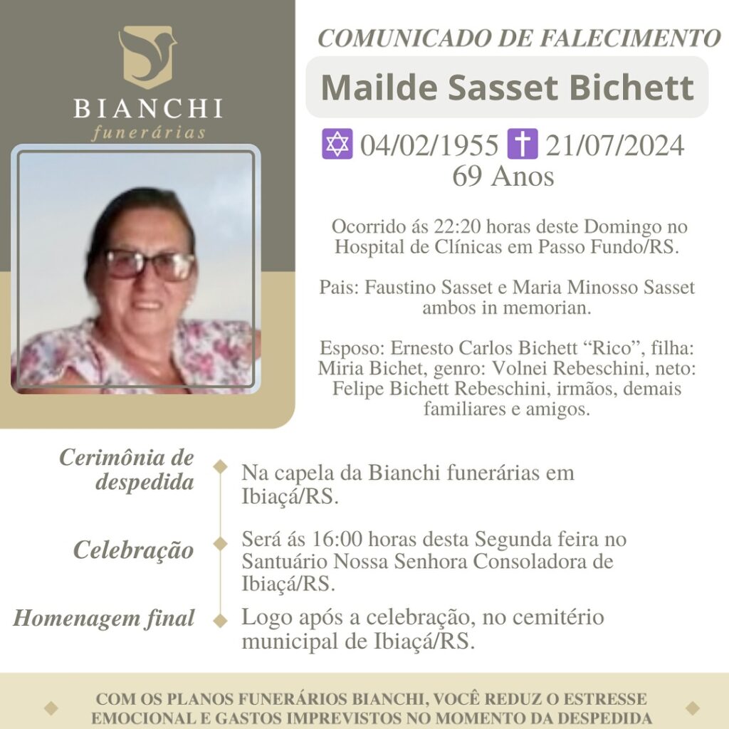 A Bianchi Funerárias, juntamente com a família Bichet, comunica com pesar, o falecimento de Mailde Sasset Bichet, ocorrido às 22 horas do dia 21/07/2024 no Hospital de Clínicas de Passo Fundo com 69 anos de idade. Seu corpo está sendo velado na Capela da Bianchi Funerárias em Ibiaçá. Celebração às 16 horas do dia 22/07/2024 e após seu sepultamento no Cemitério Municipal Ibiaçá.