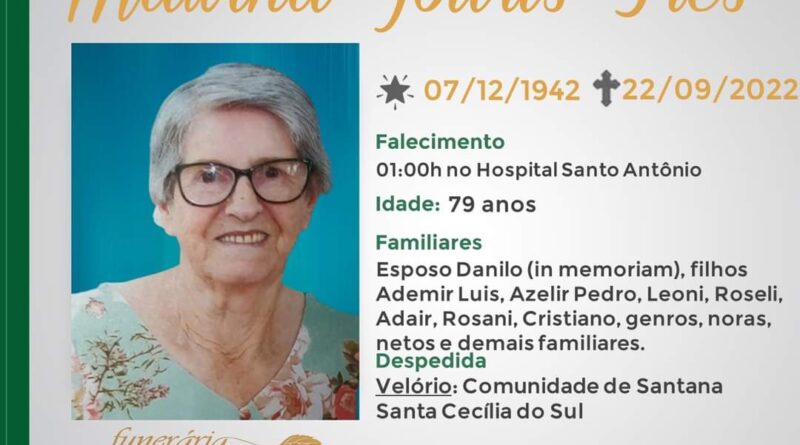 A Funerária São Cristóvão, juntamente com a família Tres, comunica com pesar, o falecimento da senhora Malvina Jouris Tres, ocorrido à 01:00 hora do dia 22/09 no HSA com 79 anos de idade. Seu corpo está sendo velado na Capela da Comunidade de Santana – Santa Cecília do Sul. Celebração a definir. Sepultamento no Cemitério da Cumunidade de Santana – Santa Cecília do Sul.