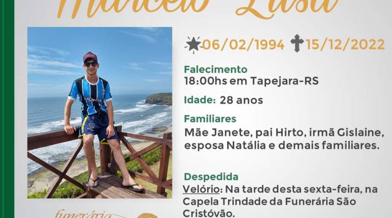 A Funerária São Cristóvão, juntamente com a família Lusa, comunica com pesar, o falecimento de Marcelo Lusa,bocorrido às 18:00 horas do dia 15/12/2022 Tapejara com 28 anos de idade. Seu corpo será sendo velado na tarde de 16/12 na Capela Trindade da Funerária São Cristóvão. Celebração às 17:00 horas e após seu sepultamento no Cemitério da Comunidade de Paiol Novo.