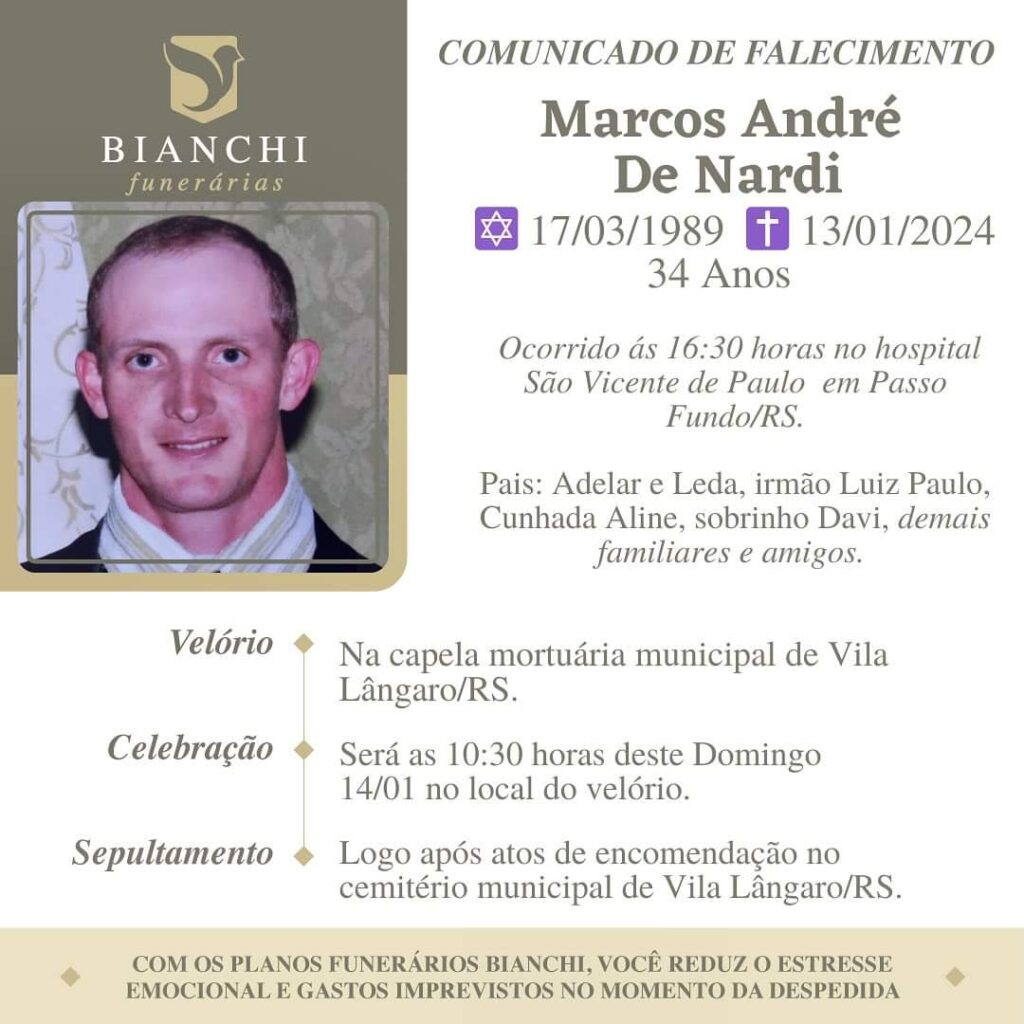 A Bianchi Funerárias, juntamente com a família De Nardi, comunica com pesar, o falecimento de Marcos André De Nardi, ocorrido às 16h30 do dia 13/01/2024 no Hospital São Vicente de Paulo de Passo Fundo com 34 anos de idade. Seu corpo está sendo velado na Capela Mortuária de Vila Lângaro. Celebração às 10h30 do dia 14/01/2024 no local do Velório e após seu sepultamento no Cemitério Municipal de Vila Lângaro.