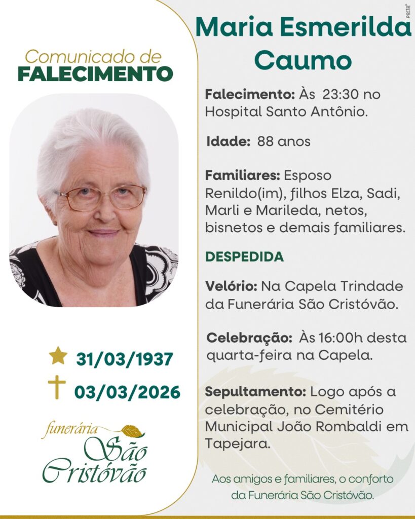 A Funerária São Cristóvão, juntamente com a família Caumo, comunica com pesar, o falecimento de Maria Esmerilda Caumo, ocorrido às 23h30 do dia 03/03/2026 no HSA de Tapejara com 88 anos de idade. Seu corpo está sendo velado na Capela Trindade da Funerária São Cristóvão. Celebração às 16 horas do dia 04/03/2026 e após seu sepultamento no Cemitério Municipal João Rombaldi de Tapejara.