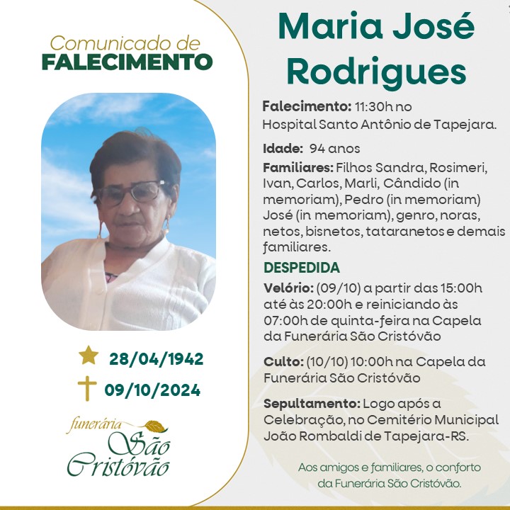 A Funerária São Cristóvão, juntamente com a família Rodrigues, comunica com pesar, o falecimento de Maria José Rodrigues, ocorrido às 11h30 do dia 09/10/2024 no HSA de Tapejara com 94 anos de idade. Seu corpo será guardado a partir das 15 horas na Capela da Funerária São Cristóvão. Culto às 10 horas do dia 10/10/2024 e após seu sepultamento no Cemitério Municipal João Rombaldi de Tapejara