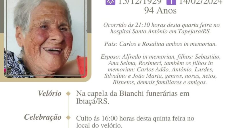 A Bianchi Funerárias, juntamente com a família da Rosa, comunica com pesar, o falecimento de Maria Juvelina Fich da Rosa, ocorrido às 21h10 do dia 14/02/2024 no HSA com 94 anos de idade. Seu corpo está sendo guardado na Capela da Bianchi Funerárias de Ibiaçá. Culto às 16 horas do dia 15/02/2024 no local do velório e após seu sepultamento no Cemitério Municipal de Ibiaçá.