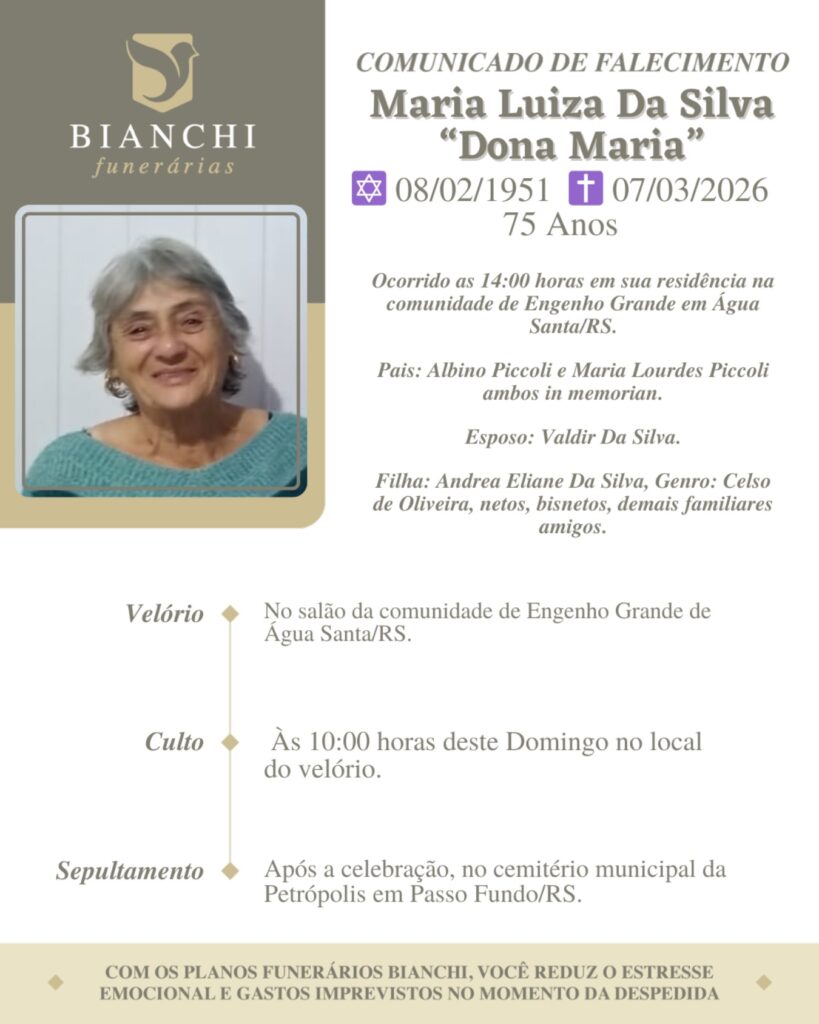 A Bianchi Funerárias, juntamente com a família da Silva, comunica com pesar, o falecimento de Maria Luiz da Silva – “Dona Maria”, ocorrido às 14 horas dia 07/03/2026 em sua residência em Engenho Grande – Água Santa com 75 anos de idade. Seu. Corpo está sendo guardado no Salão da Comunidade de Engenho Grande – Água Santa. Culto às 10 horas do dia 08/03/2026 no local do velório e após seu corpo será transladado ao Cemitério da Petrópolis de Passo Fundo onde será sepultado.
