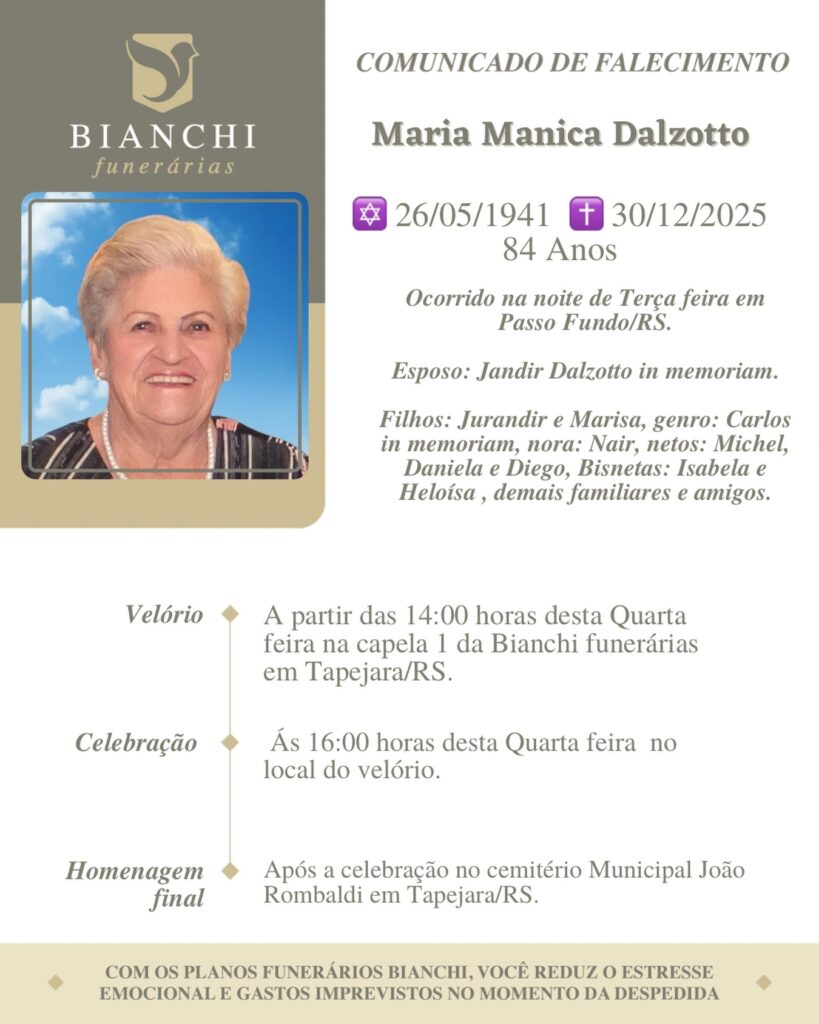 A Bianchi Funerárias, juntamente com a família Dalzotto, comunica com pesar, o falecimento de Maria Manica Dalzotto, ocorrido na noite de 30/12/2025 em Passo Fundo com 84 anos de idade. Seu corpo será velado a partir das 14 horas do da 31/12/2025 na Capela 1 da Bianchi Funerárias de Tapejara. Celebração às 16 horas no local do velório e após seu sepultamento no Cemitério Municipal João Rombaldi.