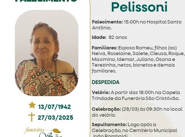 A Funerária São Cristóvão, juntamente com a família Pelissoni, comunica com pesar, o falecimento de Maria Nolícia Pelissoni, ocorrido às 15 horas do dia 27/03/2025 no HSA de Tapejara com 82 anos de idade. Seu corpo está sendo velado na Capela Trindade da Funerária São Cristóvão. Celebração às 09h30 do dia 28/03/2025 e após seu sepultamento no Cemitério Municipal João Rombaldi.