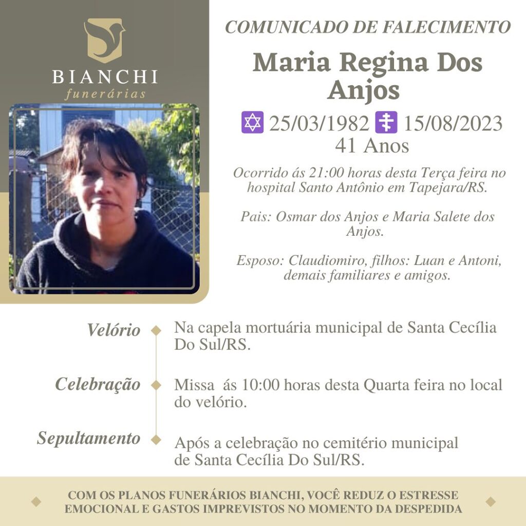 A Bianchi Funerárias, juntamente com a família dos Anjos, comunica com pesar, o falecimento de Maria Regina dos Anjos, ocorrido às 21 horas do dia 15/08/2023 no HSA com 41 anos de idade. Seu corpo está sendo velado na Capela Mortuária de Santa Cecília do Sul. Celebração às 10 horas do dia 16/08/20223 e após seu sepultamento no Cemitério Municipal de Santa Cecília do Sul