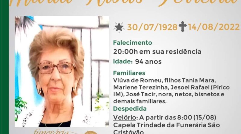A Funerária São Cristóvão, juntamente com a família Ribas Ferreira, comunica com pesar, o falecimento da senhora Maria Ribas Teixeira, ocorrido às 20:00 horas do dia 14/08/2022 em sua residência com 94 anos de idade. Seu corpo será velado a partir das 08:00 horas do dia 15/08/2022 na Capela Trindade da Funerária São Cristóvão. Celebração e enterro no Cemitério Municipal João Rombaldi de Tapejara com horário a definir.