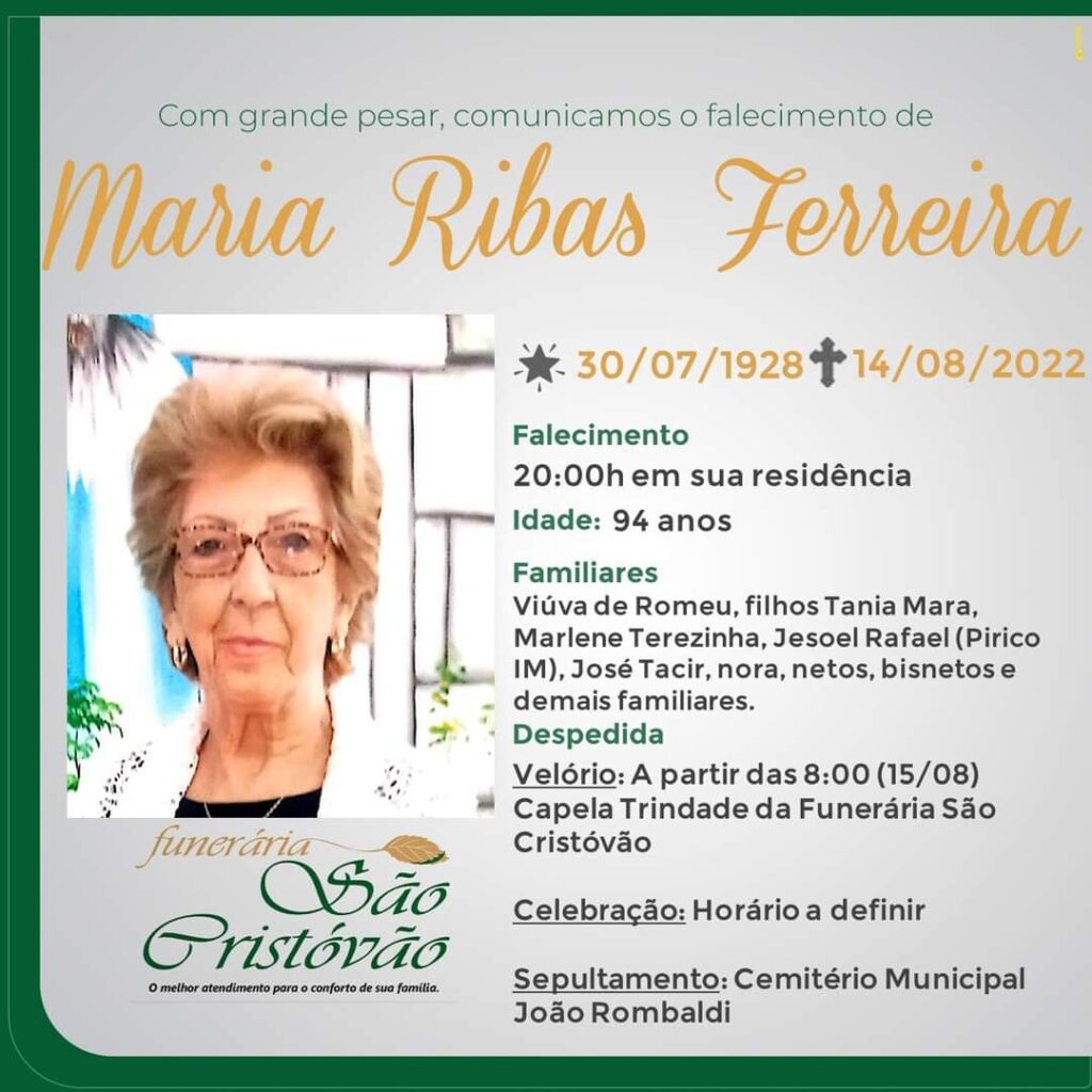A Funerária São Cristóvão, juntamente com a família Ribas Ferreira, comunica com pesar, o falecimento da senhora Maria Ribas Teixeira, ocorrido às 20:00 horas do dia 14/08/2022 em sua residência com 94 anos de idade. Seu corpo será velado a partir das 08:00 horas do dia 15/08/2022 na Capela Trindade da Funerária São Cristóvão. Celebração e enterro no Cemitério Municipal João Rombaldi de Tapejara com horário a definir.