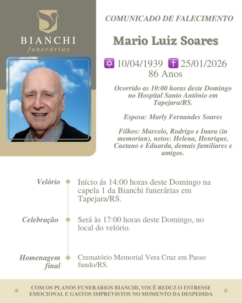 A Bianchi Funerárias juntamente com a família Soares, comunica com pesar, o falecimento de Mario Luiz Soares, ocorrido às 10 horas do dia 25/01/2026 no HSA de Tapejara com 86 anos de idade. Seu corpo está sendo velado na Capela 1 da Bianchi Funerárias. Celebração às 17 horas do dia 25/01/2026 no local do velório e pós seu corpo será transladado para o Memorial Vera Cruz em Passo Fundo onde será cremado.