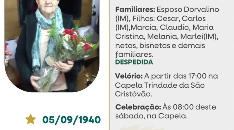 A Funerária São Cristóvão, juntamente com a família Mesavila, comunica com pesar, o falecimento de Marlene Meneghini Mesavila, ocorrido às 13h15 do dia 26/12/2025 em sua residência em Tapejara com 85 anos de idade. Seu corpo está sendo velado na Capela Trindade da Funerária São Cristóvão. Celebração às 08 horas do dia 27/12/2028 e após seu sepultamento no Cemitério Municipal João Rombaldi.