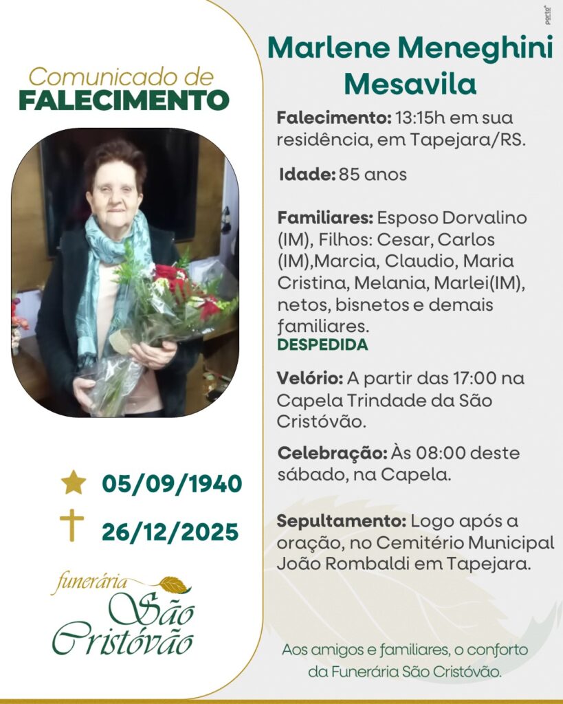 A Funerária São Cristóvão, juntamente com a família Mesavila, comunica com pesar, o falecimento de Marlene Meneghini Mesavila, ocorrido às 13h15 do dia 26/12/2025 em sua residência em Tapejara com 85 anos de idade. Seu corpo está sendo velado na Capela Trindade da Funerária São Cristóvão. Celebração às 08 horas do dia 27/12/2028 e após seu sepultamento no Cemitério Municipal João Rombaldi.